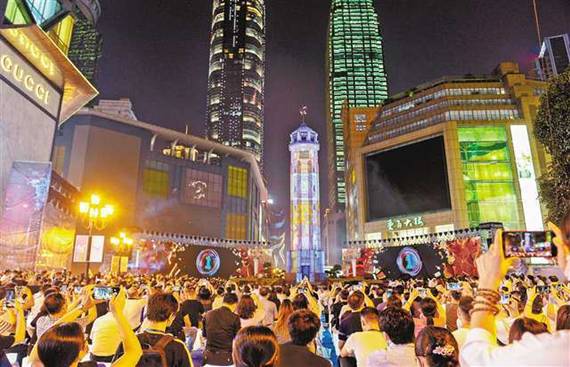 2020年7月31日晚,渝中区解放碑十字金街,3D全息投影开场秀拉开了2020不夜重庆生活节的序幕。记者 张锦辉 摄